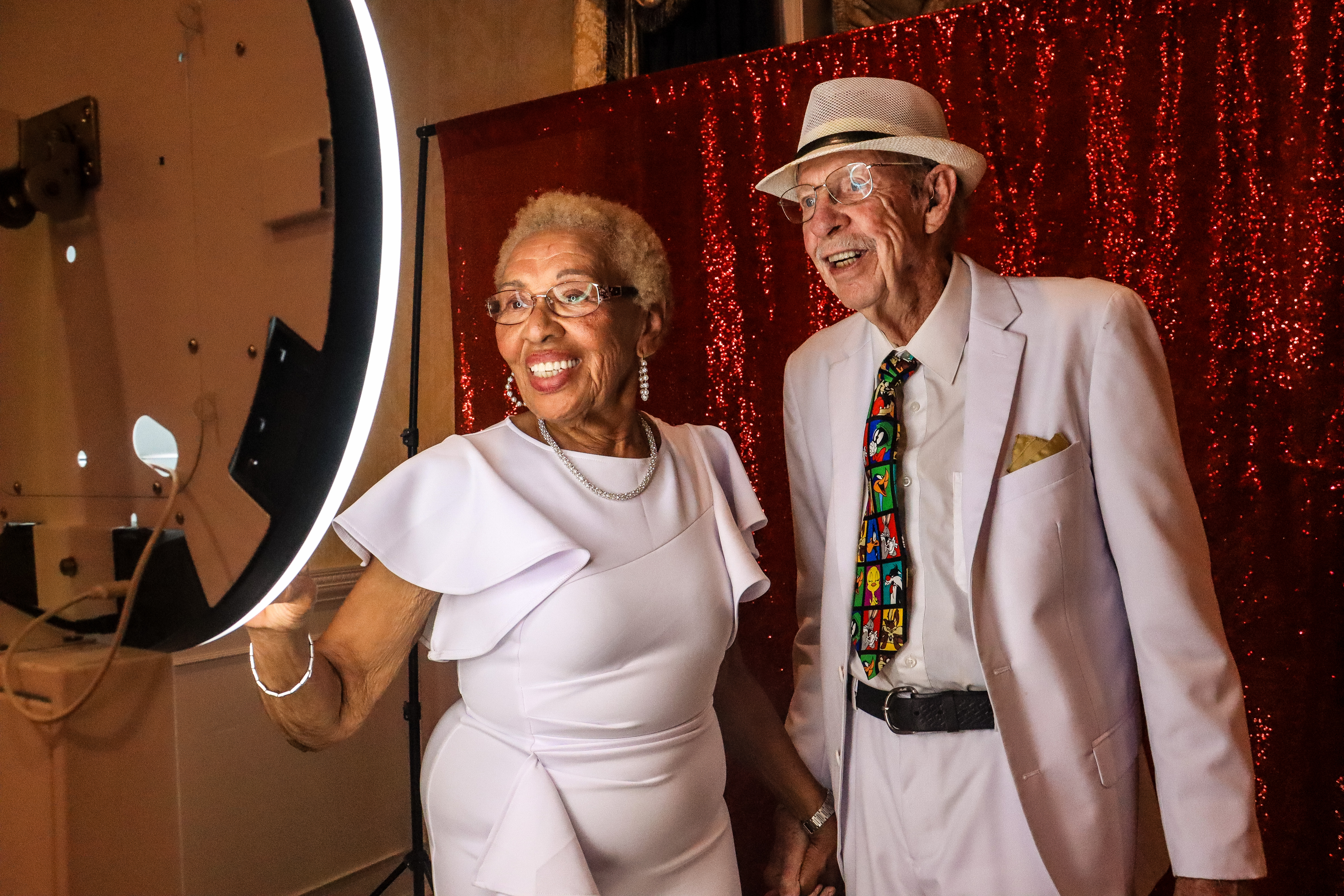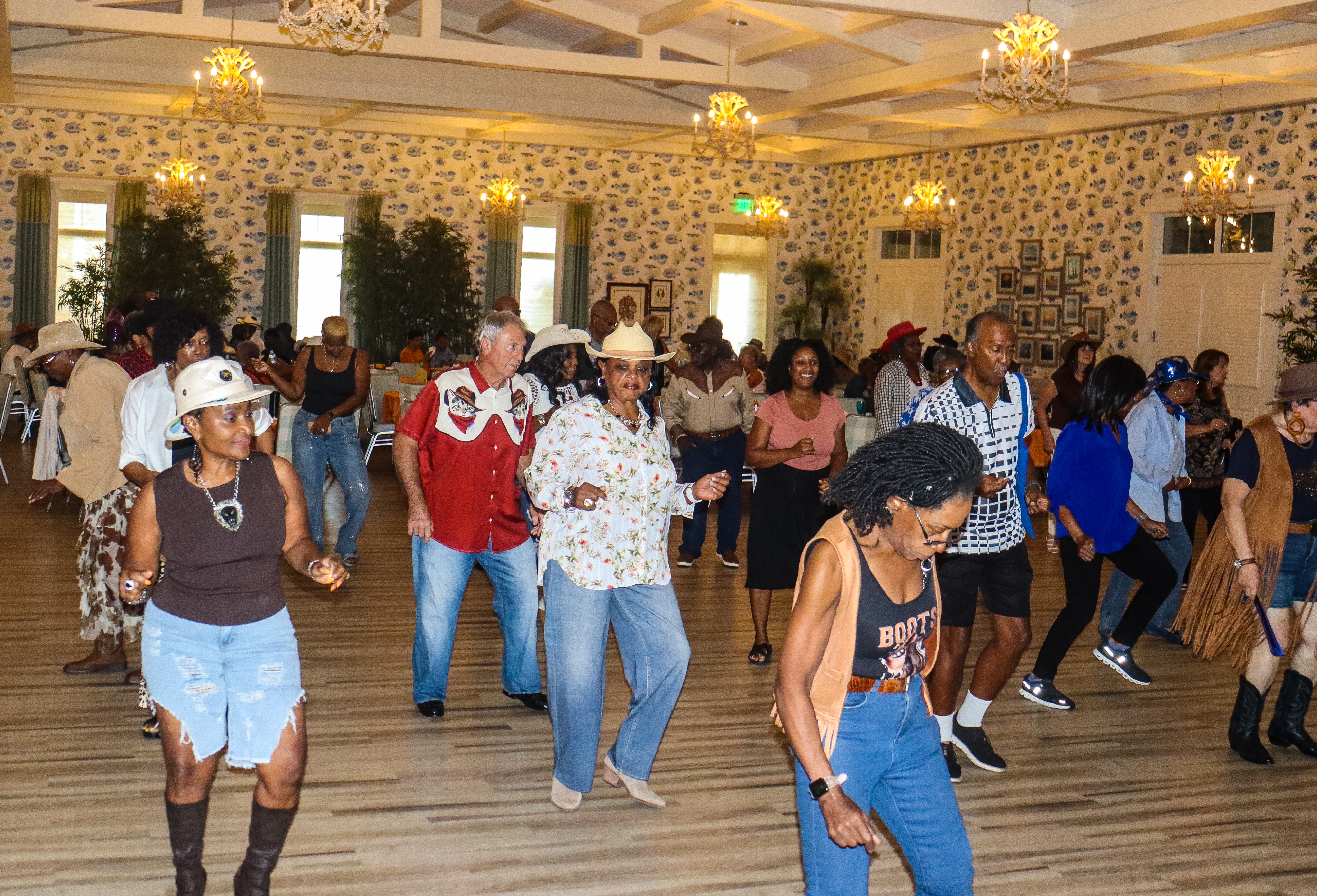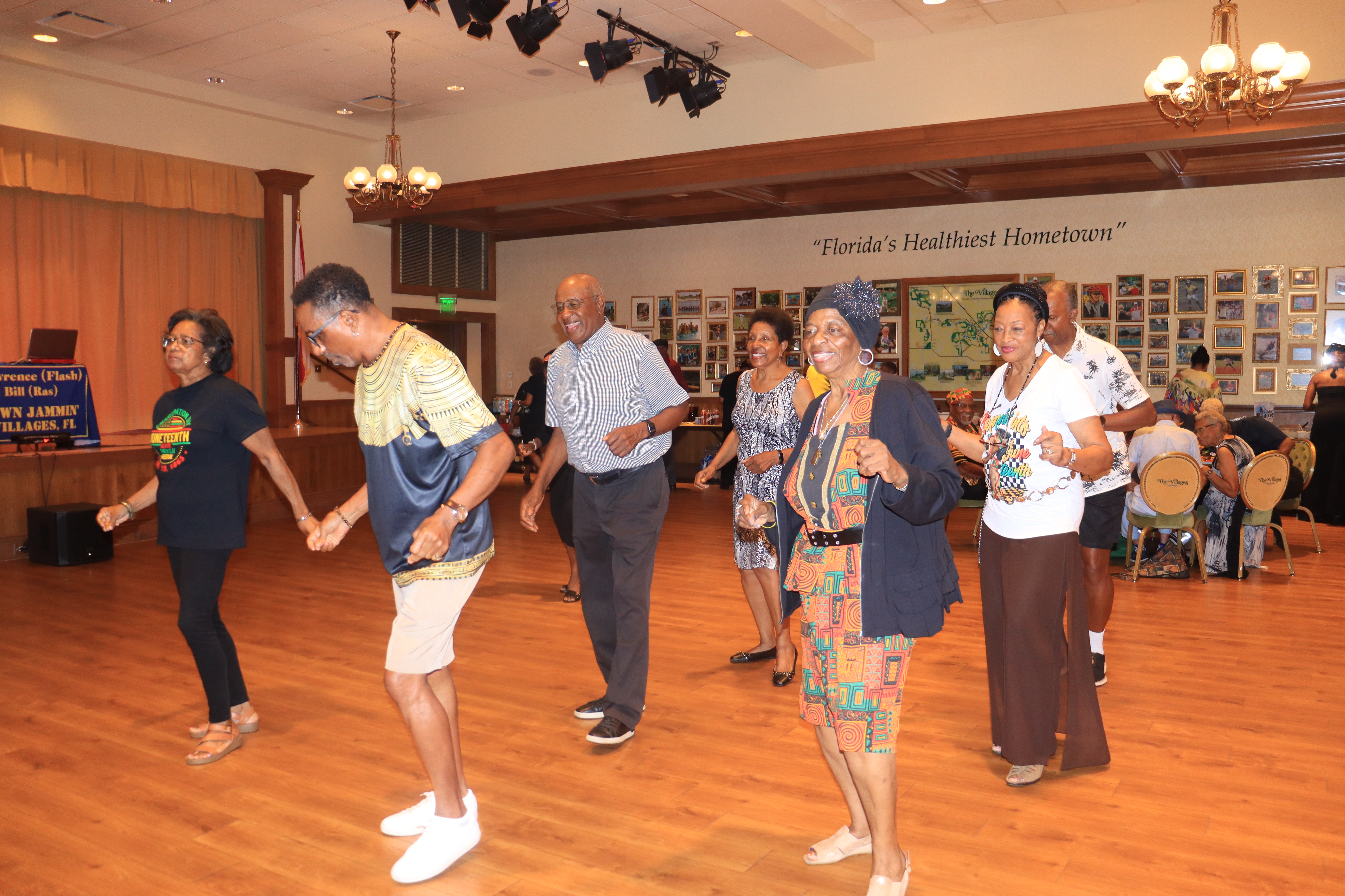 Brea Jones. Bettye Stevens-Coney made history in Leesburg more than once. The community Legend worked to ensure equal pay among school teachers in Lake County, equal representation among Lake County School administration and made the motion to create the Community Development Corporation of Leesburg.Carrie Johnson Parker-Warren (left), 9th annual “Miss Paradise Park” winner, and Martha Thompson (right), 10th annual “Miss Paradise Park” winner, pictured at the Black Beauties and Silver Springs: A Paradise Park Memory Project event at Howard Academy Community Center. Photos by Brea Jones. Brea Jones | Daily Sun. Cynthia Wilson-Graham, volunteer with Marion County Black History Museum, shows Martha Thompson’s bathing suit worn during her Miss Paradise Park win. The bathing suit is on loan as a part of the Paradise Park exhibit at the museum.Brea Jones | Daily Sun. Darlene Irvin, of the Village of Citrus Grove, leads the conga line on the dance floor during the The African American Club of The Villages’ Juneteenth event June 15. Lugusta “Gus” Gray (left) and David Cayson sign their name on historic photos for guests during the during the Heart of the Turf: Racing’s Black Pioneers Exhibit / Meet and Greet on Sept. 18.